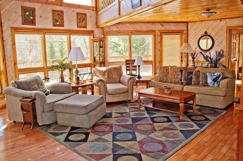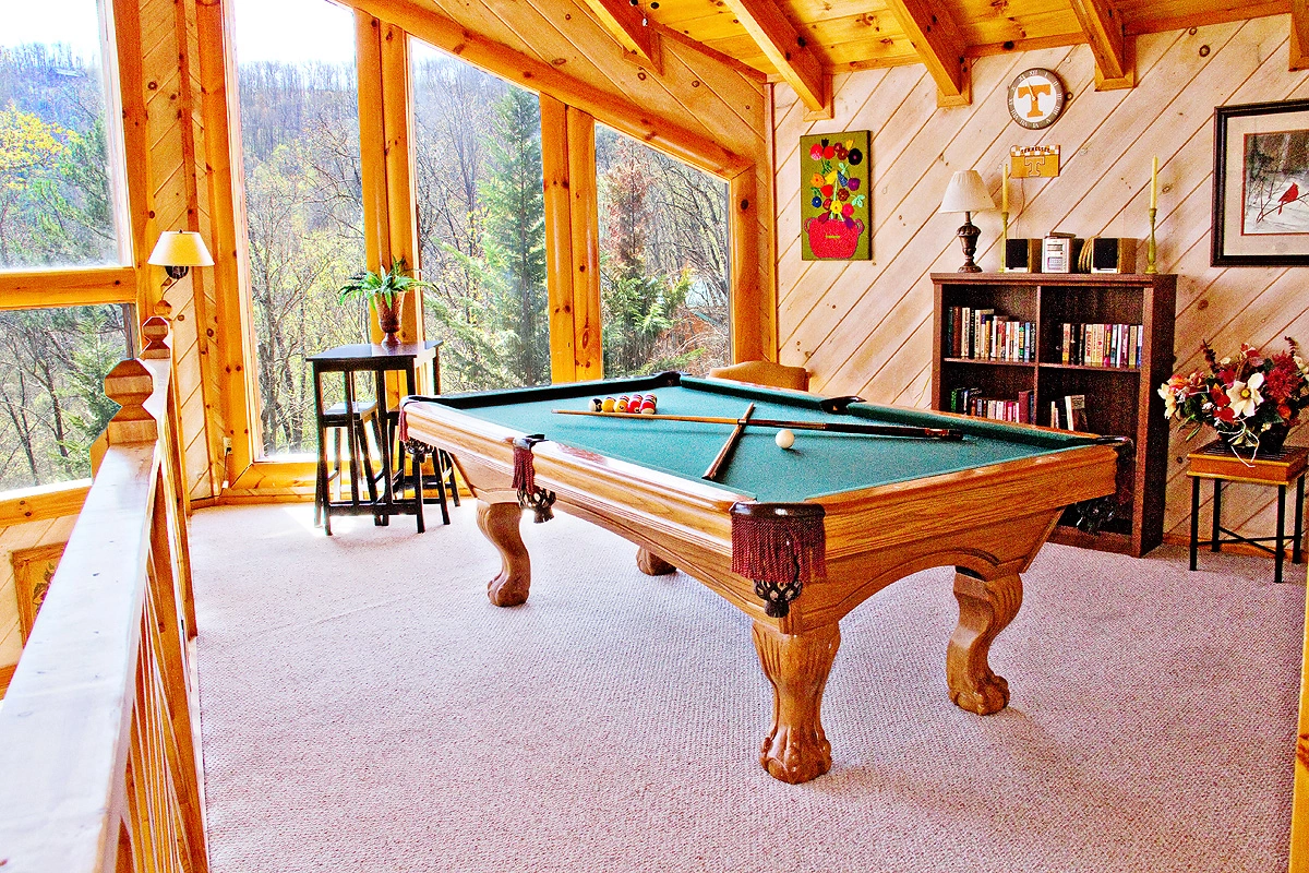 With plenty of space to spread out, the cabin’s lower level offers a second living area complete with a pool table, multi-game arcade, and a TV—a great spot for fun and relaxation.