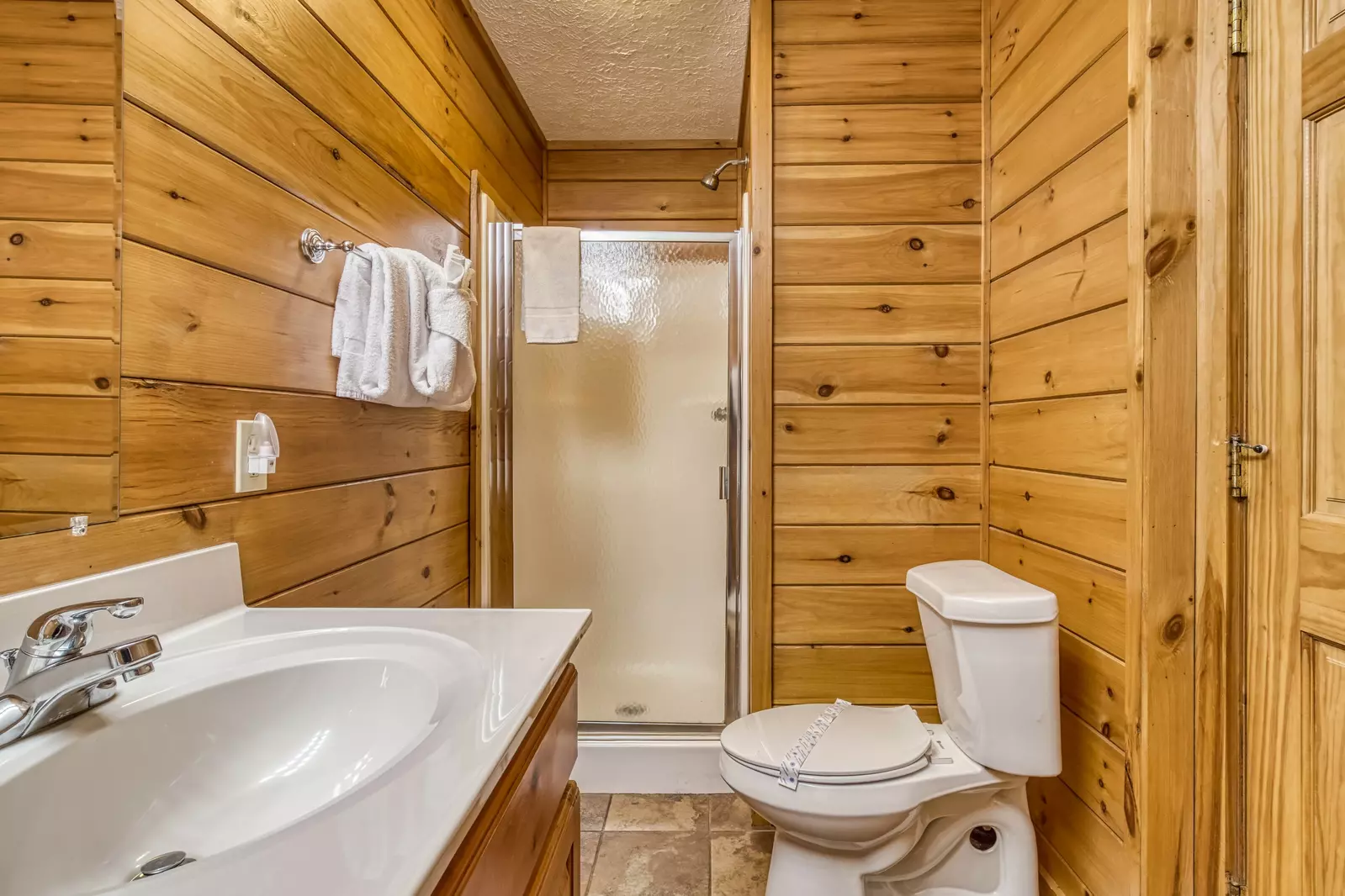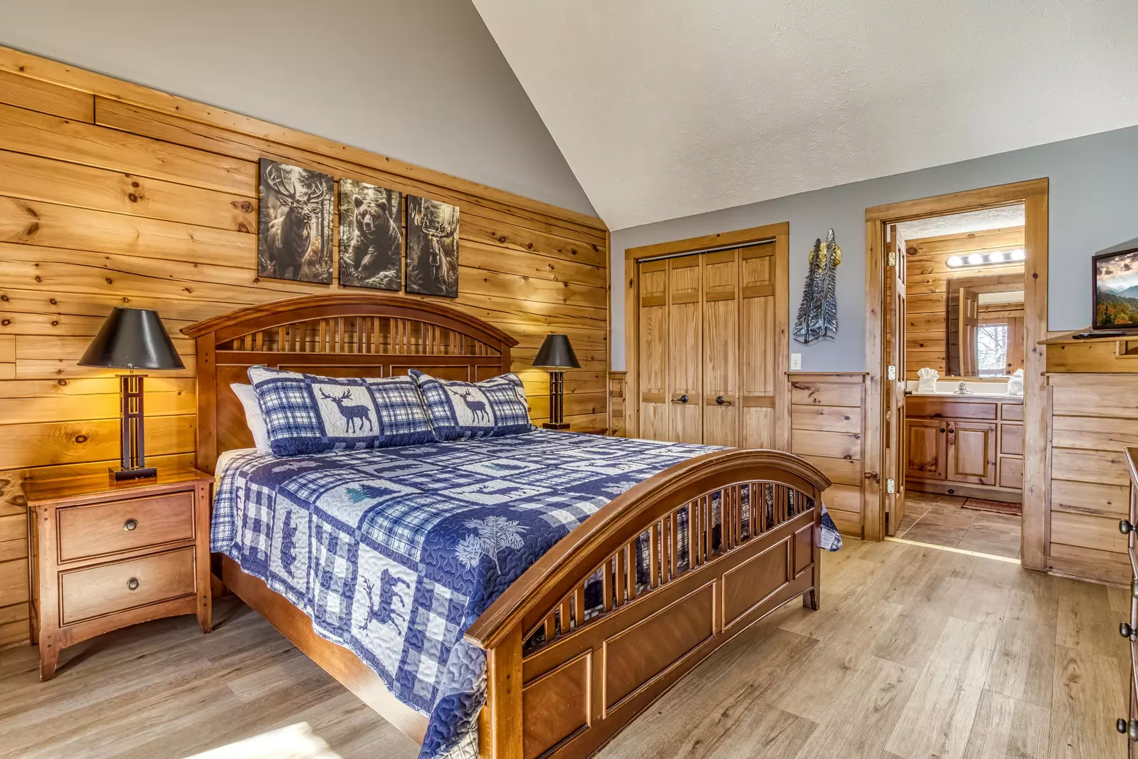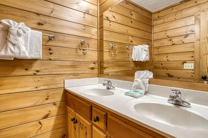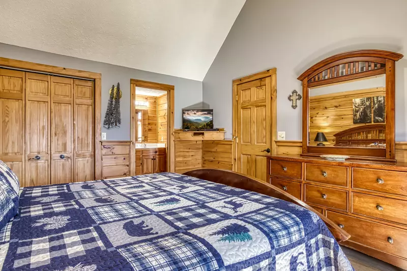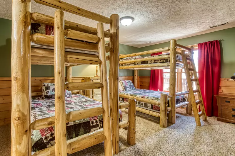 The cabin’s four thoughtfully designed bedrooms ensure everyone enjoys restful nights. On the main level, the primary and second bedrooms each feature king-sized beds, private deck access, and en suite bathrooms. Downstairs, the third bedroom boasts two queen beds and its own deck access, while the fourth bedroom is outfitted with two twin-over-full bunk beds and an en suite bathroom—perfect for children or extra guests. The cabin also includes a full-sized washer and dryer