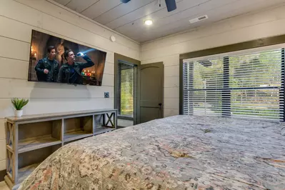 The upper level of Bear Haven features the remaining three bedrooms. Two of these rooms offer King beds, while the fourth bedroom is equipped with full bunk beds, perfect for children or a group of friends. Each bedroom has its own private full bathroom, providing privacy and convenience. This level also includes a common area, complete with a flat-screen TV and a futon for additional sleeping space.