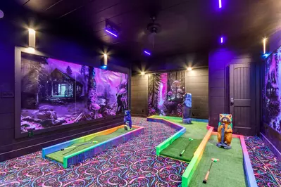 Upon entering Bear Haven, you’ll be greeted by the lower level, dedicated entirely to fun and relaxation. Challenge your family to a round of black light putt-putt golf, enjoy a movie in the private theater room, or take a refreshing dip in the indoor swimming pool. For your convenience, there's also a half bathroom on this level.