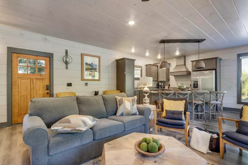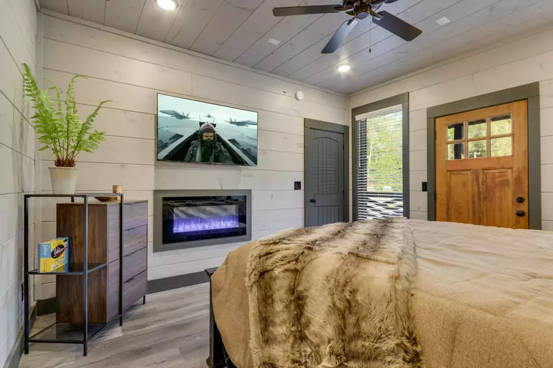 The main living areas are located on the mid-level of the cabin. Prepare delicious meals in the fully equipped kitchen, outfitted with modern appliances. Gather around the spacious dining table that comfortably seats 10, or use the additional bar seating. The cozy living room, featuring a comfortable electric fireplace and plenty of seating, is perfect for unwinding after a day of adventure. Step outside onto the expansive deck, ideal for outdoor gatherings. This level also includes one of the four bedrooms, complete with a plush King bed and an en-suite full bathroom.