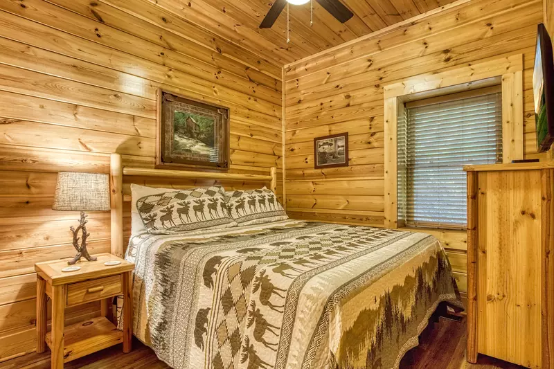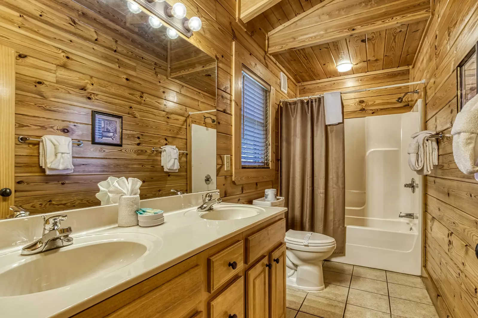 The cabin has an extra-large master bedroom on the top level, with a king bed, queen sleeper sofa, a private Jacuzzi, large master bath with double vanity sinks, and a 50" UHD LCD Smart TV and Blu-Ray player. The lower level features a game room with a wet bar, mini-fridge, and a game table that seats four. This level also includes 2 bedrooms (one queen and one king), each with their own bathroom.