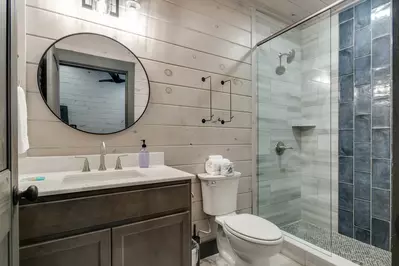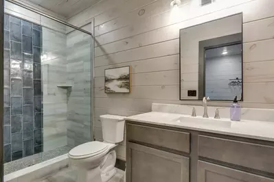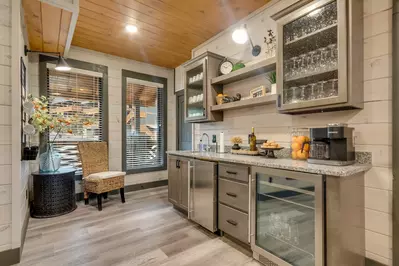 The mid-level of the lodge features a fully equipped kitchen, two dining room tables, granite countertops, and bar seating. This level boasts an open floor plan with the kitchen, dining room, and living room all together. The living room has lots of comfortable seating and wraps around a tall stacked stone fireplace. There's also a large TV on the mantle, and another laundry room and a half bathroom. There are four bedrooms on this level, each with a king bed and its own private bathroom. Additionally, there is a large covered porch with plenty of seating and a charcoal grill.