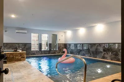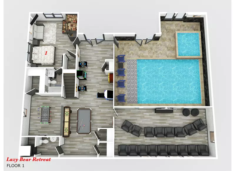 The lower level of LAZY BEAR RETREAT is where guests can find the family suite, complete with a king-sized bed, a set of queen bunk beds, a futon and a private full bath. This level is loaded with amenities like a movie theater room, a pool table, a shuffleboard table, video games, and a large indoor swimming pool with a separate jacuzzi. There's also a half bath and a washer and dryer available, so guests can pack light if they choose. For relaxation, there is a covered porch with comfortable seating.