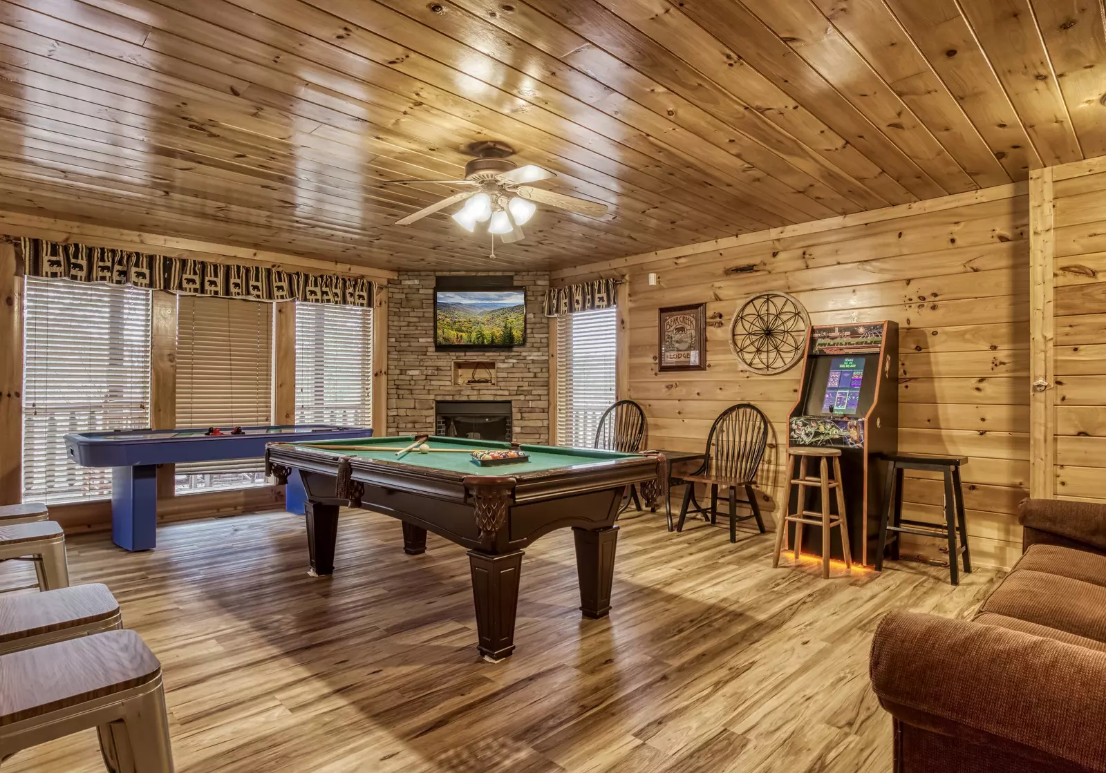 The game room within "Mountain Blessings" is a hub of entertainment suitable for everyone. You can engage in a thrilling game of pool or simply enjoy the role of a spectator. Additionally, step outside onto the deck to revel in your private hot tub while basking in the awe-inspiring beauty of the majestic mountain views, one of nature's most cherished gifts.
