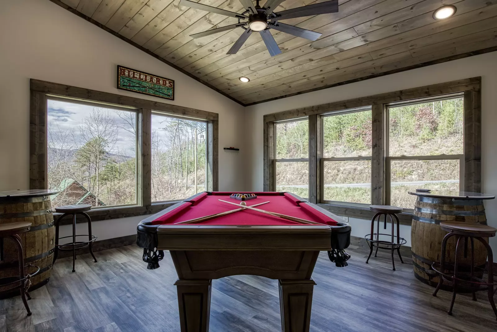 Entertainment finds its haven in the game room, boasting a pool table and a delightful Multi-cade game loaded with all of your 1980's favorites like Ms. Pac-man, Frogger, Galaga and Donkey Kong for endless amusement. Yet, the true pièce de résistance lies outdoors, where expansive porches unveil sweeping panoramas of the Great Smoky Mountains. Greet the dawn with a cup of coffee, as the sunrise bathes the sky in hues of gold, or unwind as the mountains bask in the soft embrace of sunset.
