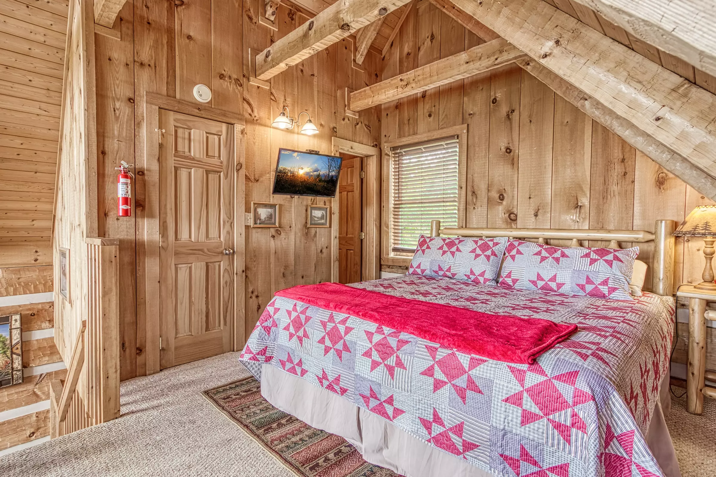 Upstairs in the open loft area is the romantic bedroom with king size bed, half-bath, a 32" TV hanging on the wall (with streaming service).